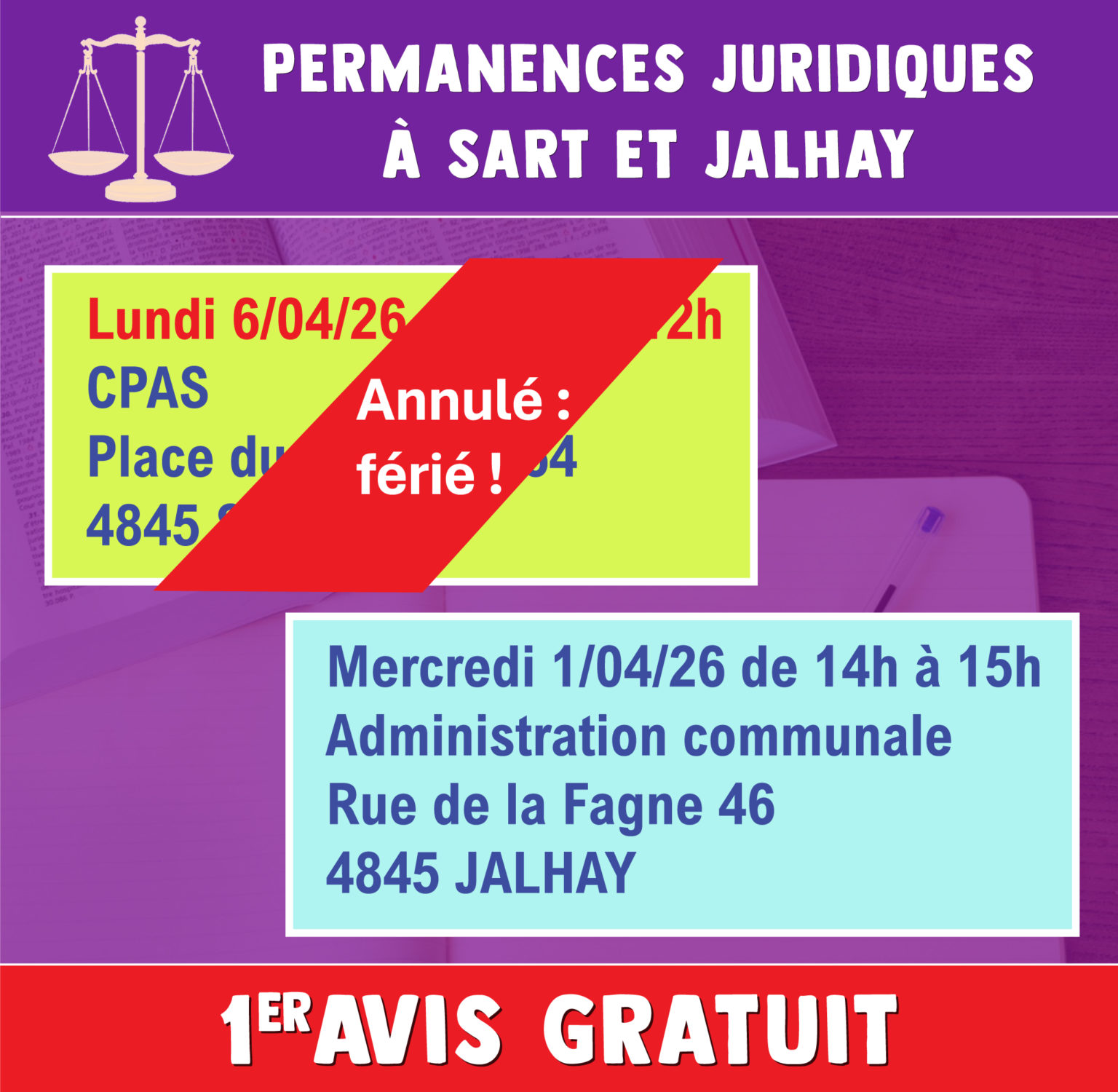 Accueil > Actualités CPAS > A la une > ATTENTION ! Permanence juridique uniquement à Jalhay ce mois-ci ! ATTENTION ! Permanence juridique uniquement à Jalhay ce mois-ci ! Partagez cet article Tweet