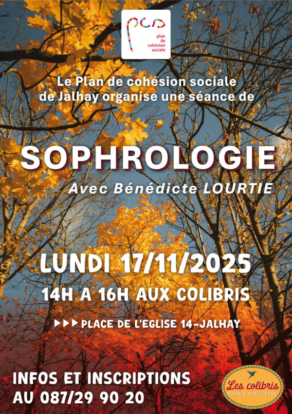 Accueil > Agenda CPAS > CPAS > Séance de sophrologie aux Colibris – 14h à 16h – Inscriptions au 087/29 90 20 Séance de sophrologie aux Colibris – 14h à 16h – Inscriptions au 087/29 90 20 Partagez cet article Tweet Date de début : lundi 17 novembre, 2025 Date de fin : lundi 17 novembre, 2025